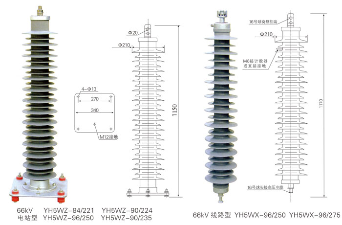 出口 66KV電站型 YH5WZ-84/221 YH5WZ-90/224 YH5WZ-96/250 YH5WZ-90/235 66KV 線路型 YH5WX-96/250 YH5WX-96/275