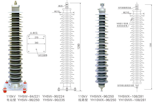 出口型 110KV電站型 YH5W-84/221 YH5W-90/224 YH5W-96/250 YH5W-90/235 線路型 YH5WX-96/250 YH5WX-108/281 YH10WX-96/250 YH10WX-108/281