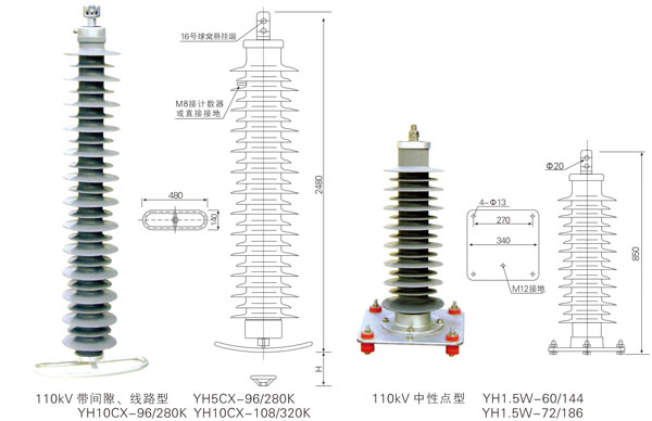 出口型 110KV帶間隙、線路型 YH5CX-96/280K YH10CX-96/280K YH10CX-108/320K