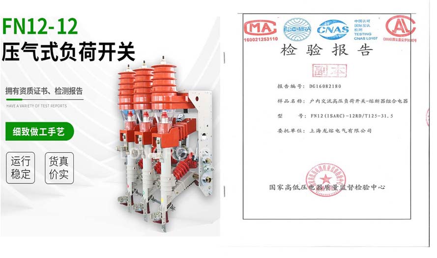 概述 FN12-12D/630-20型戶內(nèi)交流高壓負(fù)荷開關(guān)(以下簡稱FN12-12D負(fù)荷開關(guān))是額定電壓為12KV,額定頻率為50Hz的三相高壓開關(guān)設(shè)備,用于分合負(fù)荷電流,空載變壓器和電纜充電電流,關(guān)合短路電流。配裝接地開關(guān)的負(fù)荷開關(guān),可以承受短時電流。 FN-12(R)D/100-31.5型高壓負(fù)荷開關(guān)-熔斷器組合電器(以下簡稱FN12-12(R)D組合電器),是在FN7-12D負(fù)荷開關(guān)與S□LAJ-12(XRNT□-10)高壓限流式熔斷器組合在一起的戶內(nèi)高壓開關(guān)設(shè)備。它可以開斷直至短路電流的任何電流;負(fù)荷開關(guān)開斷工作電流,熔斷器開斷短路電流,聯(lián)合開斷工作電流與全短路電流之間的任何電流,同時熔斷器通過其碰撞使負(fù)荷開關(guān)分閘。